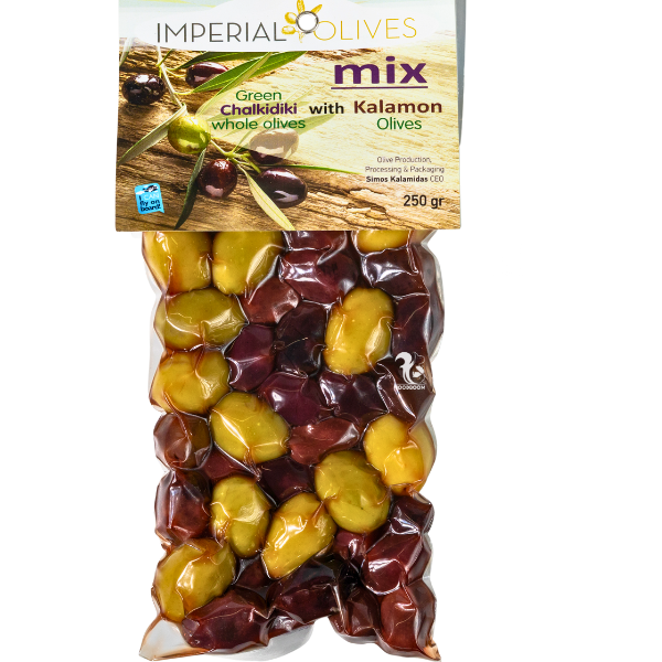 Оливки Греція Imperial Mix with Kalamon – це вдало підібраний мікс автентичних грецьких оливок: насичені Kalamon (Kalamata) та свіжі зелені. Відмінний вибір для тих, хто цінує багатство смаків у одному пакеті.